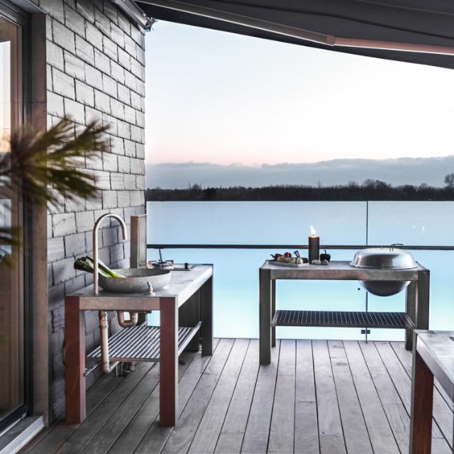 We have two different outdoor kitchen designs, both are long-lasting and require minimum maintenance – Our Savra kitchen is made from galvanised steel and Nor is made from our reclaimed azobé wood. Both designs can be made in dimensions to suit and if you have your eye on an integral grill or side burner, then we can adapt the outdoor kitchen to suit.